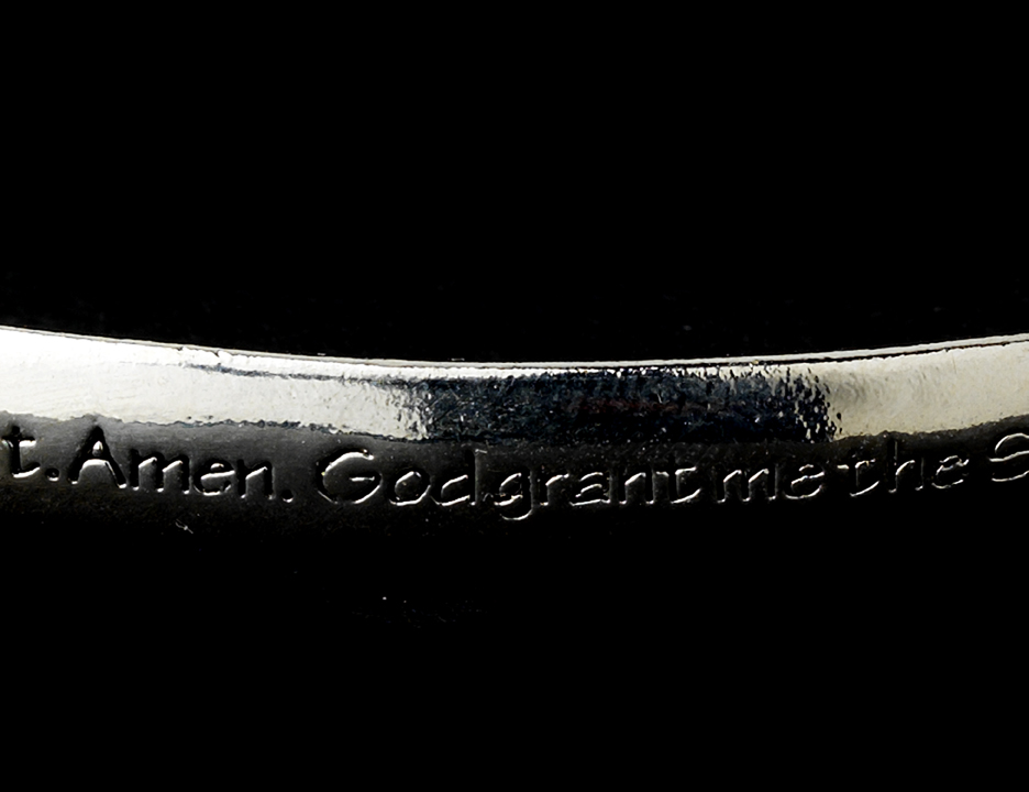 Simple and uplifting, this silver plated bracelet in engraved with the Peace Prayer of Saint Francis.This bracelet has an inner circumference of 8" in length.