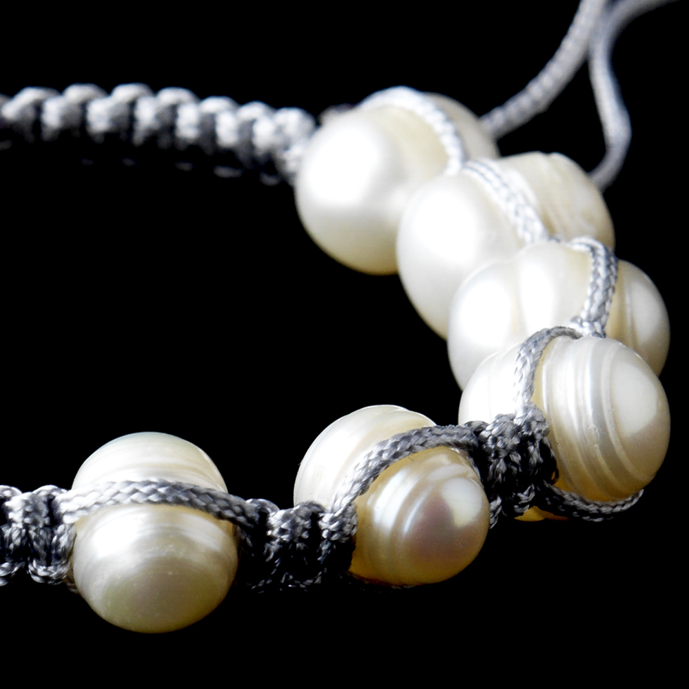 A braided light blue color band wrapping around numerous fresh water pearls. Simplistic yet chic, this bracelet gives off a subtle touch of color and charm to your everyday wear. Bracelet is adjustable to provide the perfect fit for most wrist sizes.
