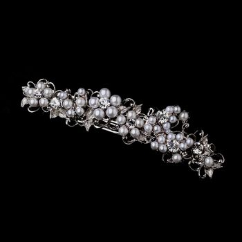 This elegant vintage inspired barrette shines in antique silver with elegant white faux pearls and dazzling rhinestones accompanied with dainty silver plated leaves. This piece will add a little extra glamour to any hairstyle.