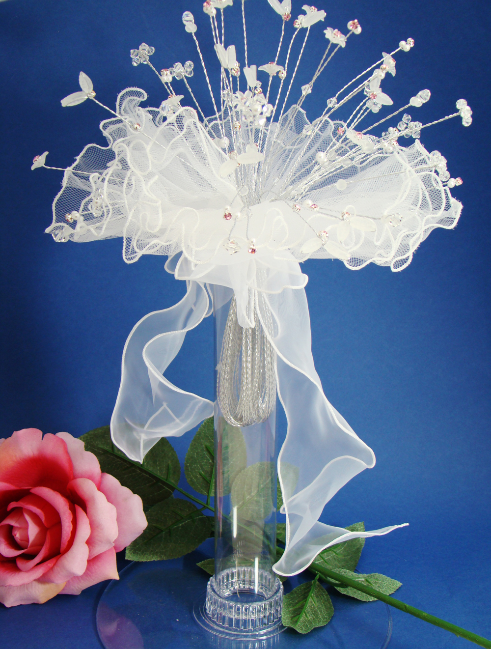 This is a great way to show off your bridal or bridesmaids bouquets while at the reception. Why lay your bouquet down on the table when you can create a stunning display by placing the stem in this affordable acrylic style vase.