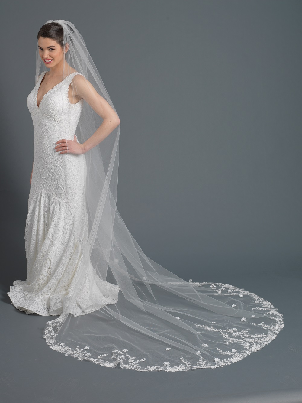 Stunning single layer cathedral bridal veil with floral embroidery and rhinestone accent.