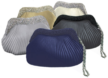 Pleated evening bag adorned with crystal beads along the top. Can be worn as a clutch, or with the silver shoulder strap.
