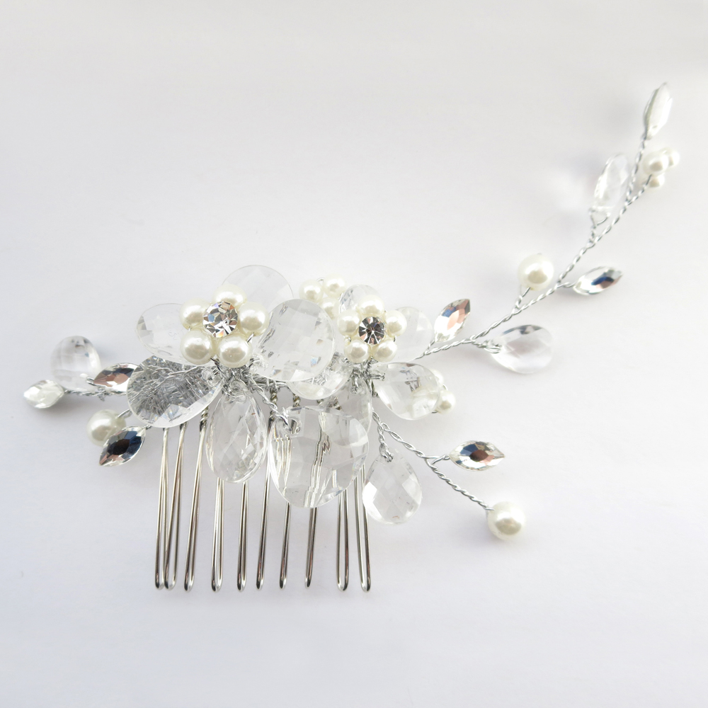 This beautiful floral accent décor comb sparkles with bouquets of Swarovski crystals, rhinestones and faux pearls. Silver plated and artistic, the right side curls over and above the piece, while the left side curls below.