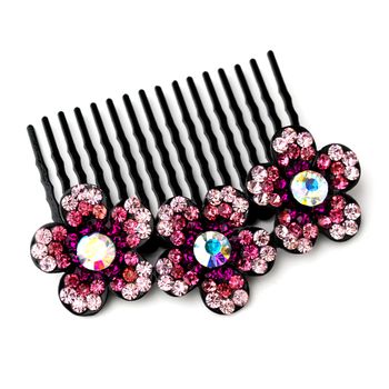 This fun and festive hair comb features three sparkling Aurora Borealis crystals set in black rhodium flower petals encrusted with sparkling light rose, dark rose and fuchsia colored rhinestones. This is a perfect and colorful accessory for any occasion.