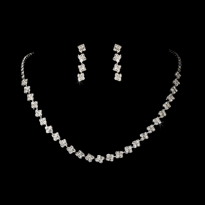 This necklace and earring set will definitely make you feel radiant! Featuring a fabulous and simple design composed of glittering clear princess-cut rhinestones that glisten in the light. This set is a great choice for weddings, proms, homecomings or any special occasion!