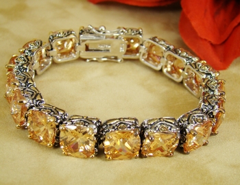 This beautiful designer inspired bracelet features silver plating and champagne crystals. A perfect accessory for your bridesmaid's dresses. This bracelet measures 7" in length.