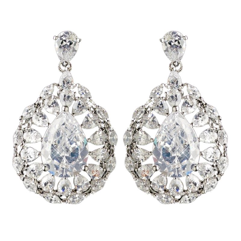 These glamorous bridal earrings feature a lovely large teardrop cut in the center surrounded by two rings of small pear and marquise cuts encrusted in rhodium plating. These rhodium plated cz teardrop earrings are a perfect choice for modern, classic, or vintage-inspired wedding.