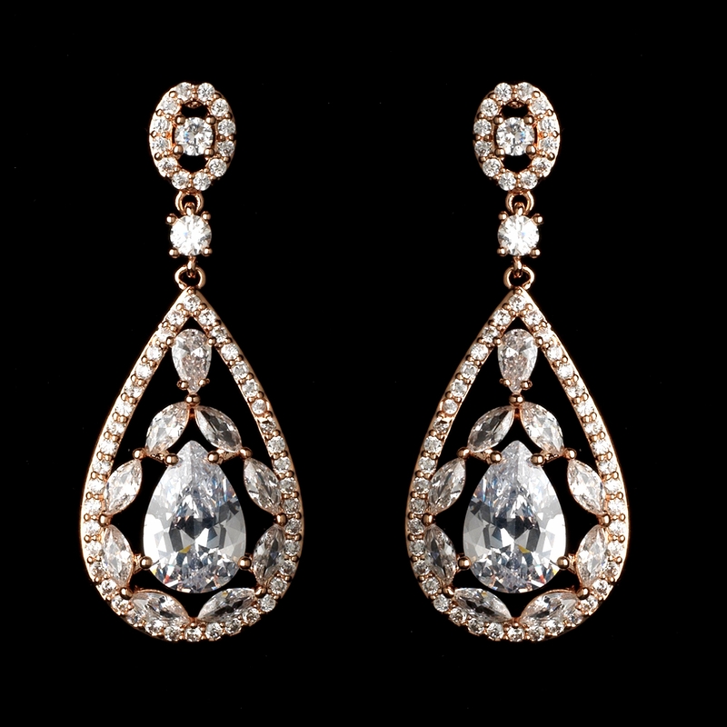 Rose Gold Clear Multi Cut Teardrop CZ Crystal Chandelier Bridal Wedding Earrings 7769