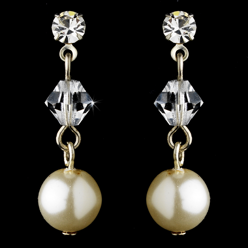 Simple and elegant, these gold plated earrings feature a ivory faux pearl and a clear Swarovski crystal. A perfect complement to your white or ivory wedding dress. These earrings measure 1" in length.