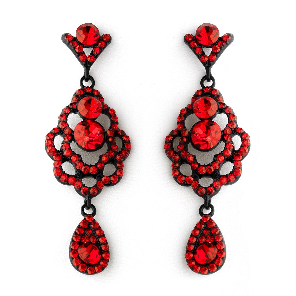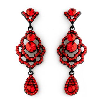 A beautiful set of chandelier earrings featuring gorgeous sparkling ruby red crystals. The perfect colorful touch for any special occasion.