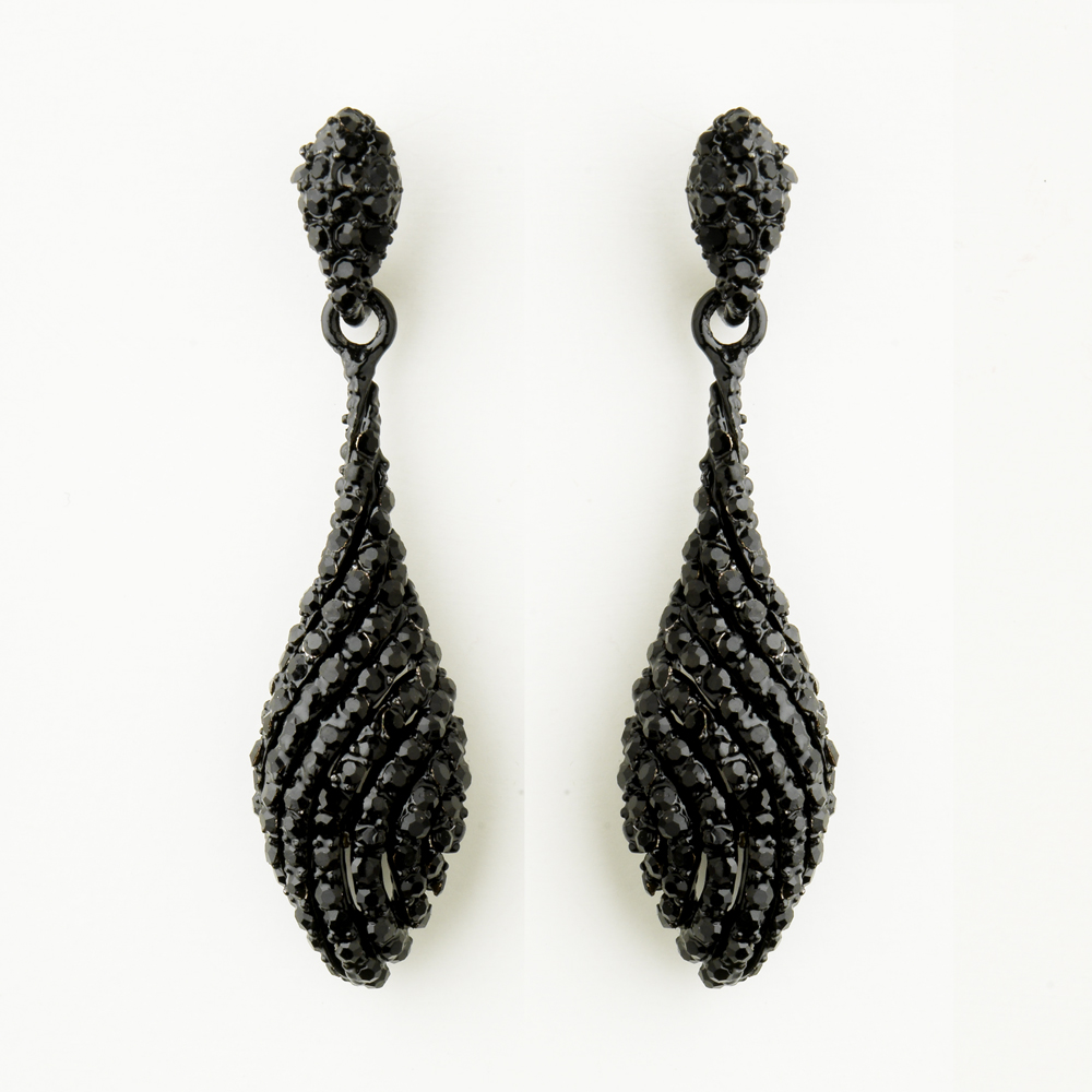 This set of exquisite jet black pave rhinestone dangle earrings make a lovely accessory for weddings, proms, homecomings or any special occasion in need of some extra color and sparkle. They feature a dazzling black tear-drop design adorned with dozens of glittering jet black rhinestones.
