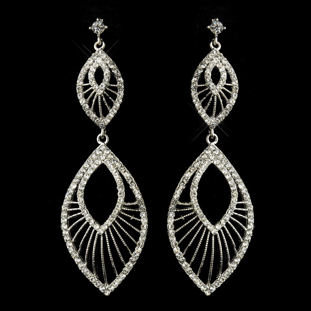 These extraordinary antique silver clear crystal rhinestone bridal dangle earrings will look exceptional on any classic, modern or vintage inspired bride. They feature dozens of glittering clear crystal rhinestones on fabulous marquise shaped designs that hang down to a lovely romantic length.