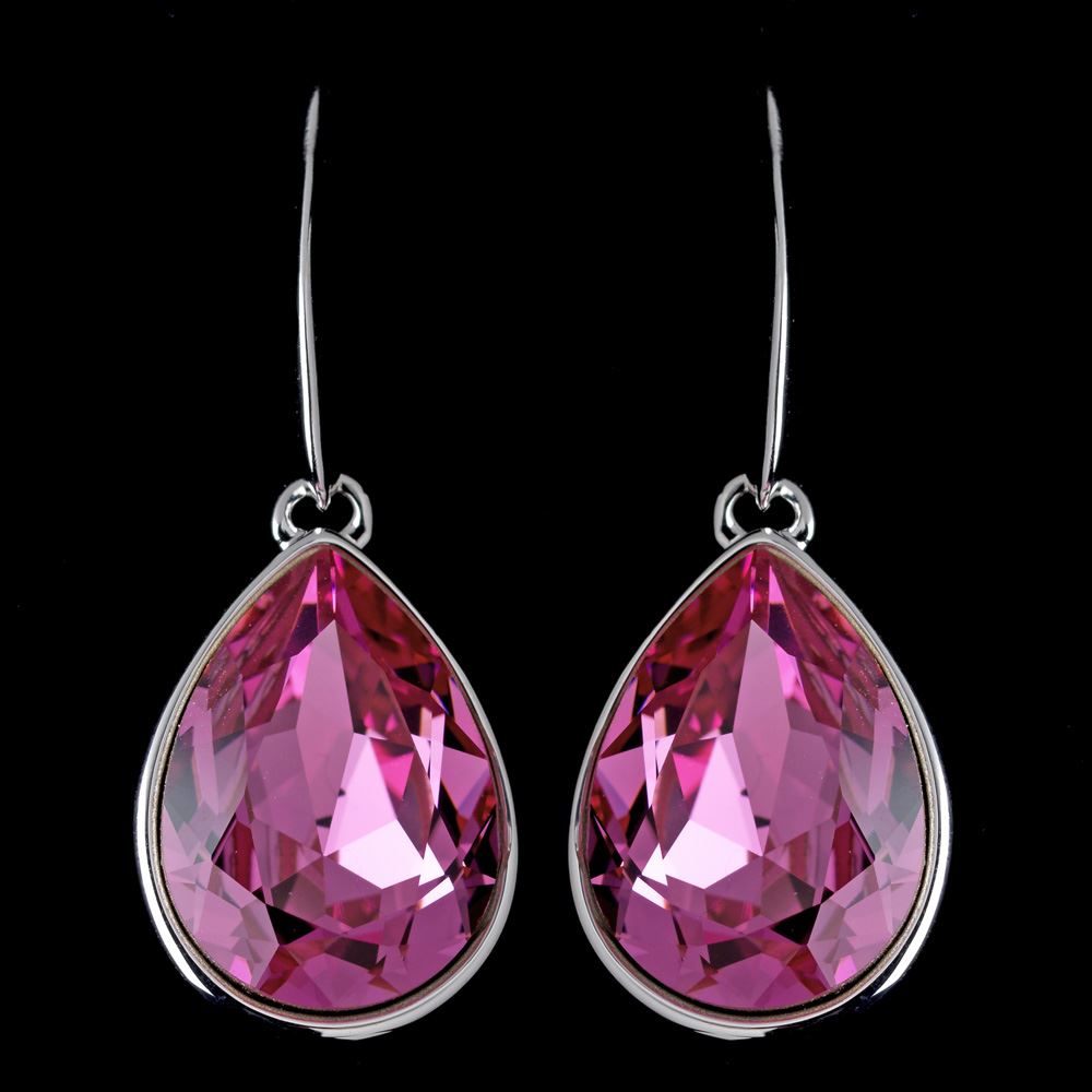 These dangle style earrings feature a lovely rose teardrop crystal that drop down from a delicate silver hook. These silver plated earrings are a beautiful addition to include into your special occasion celebration.