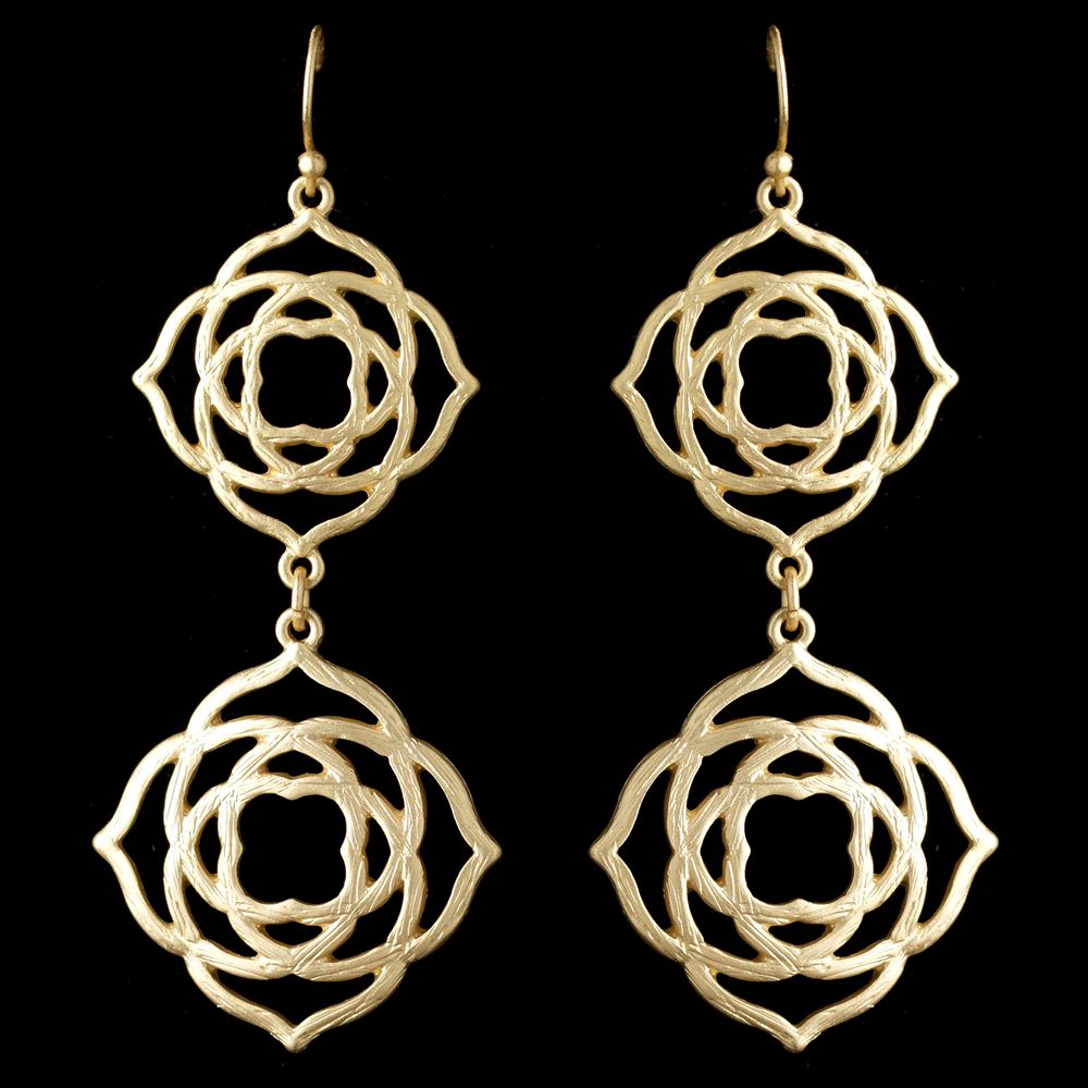 This simple earrings is decorated with a double floral drop in a light gold matte setting. A gorgeous floral earrings to include into your special occasion celebration.