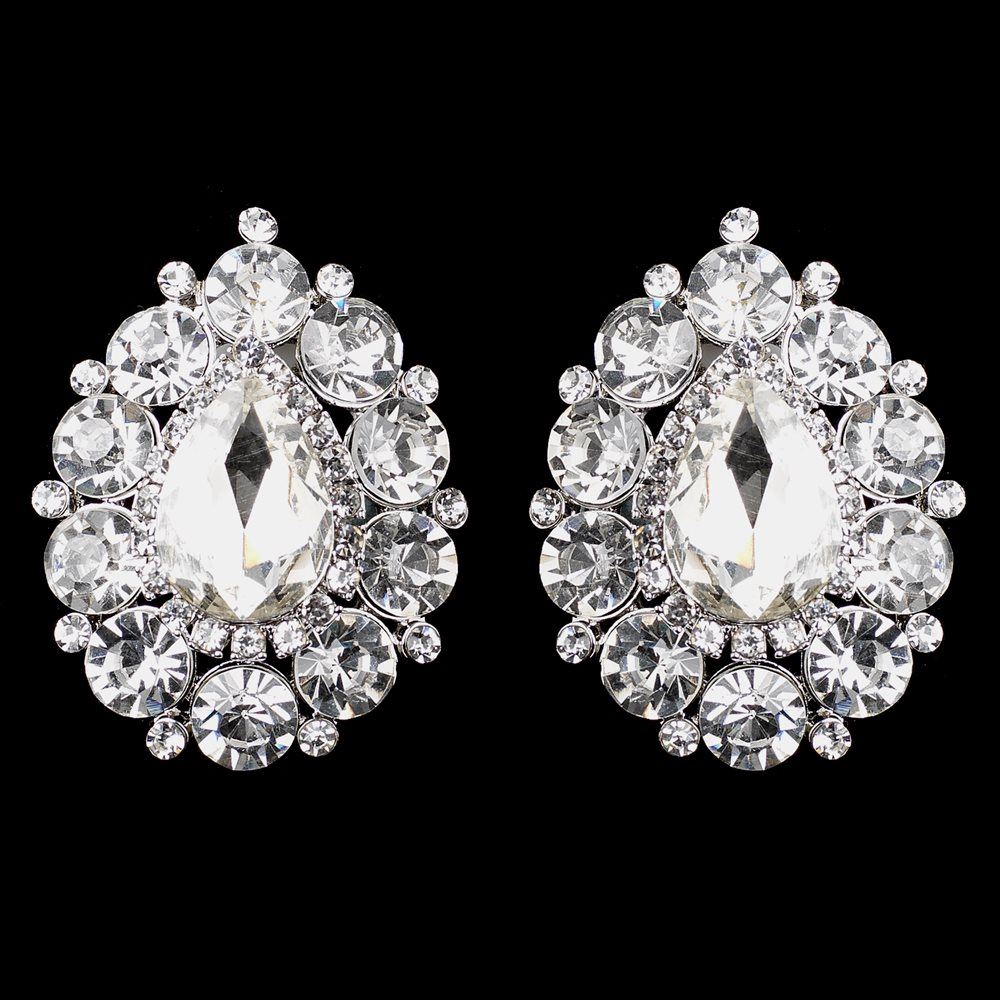 Shimmering and radiant, these clip-on silver earrings feature a large teardrop rhinestone surrounded by a unique combination of round rhinestones. These earrings are certainly eye-catching and are an excellent option for your next big event!