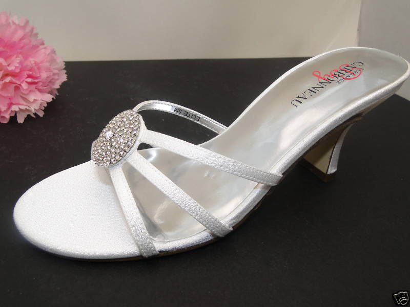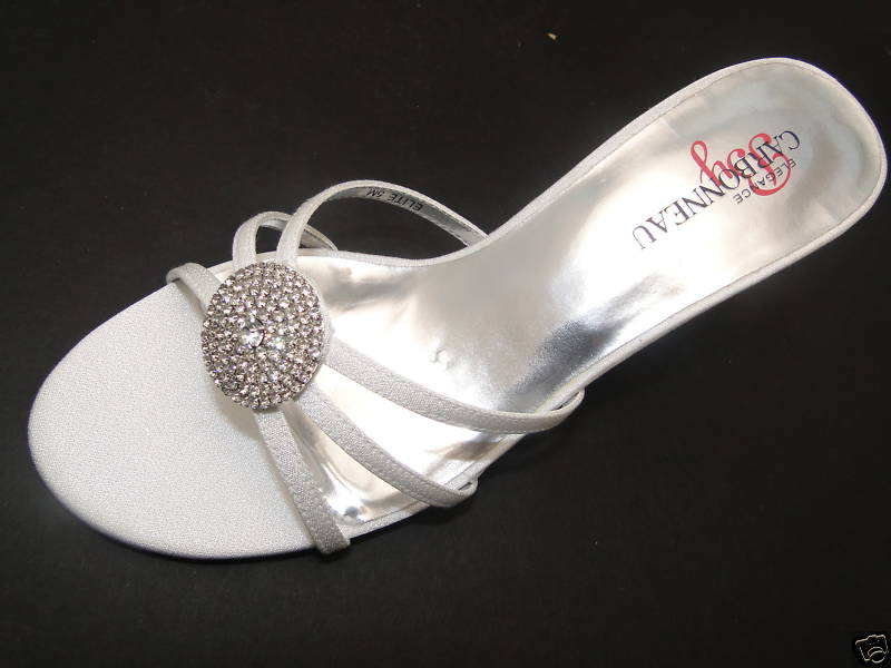 This shoe has three dainty straps that go across the front, and gather in the center of the shoe. It has an elegant 1 1/4 inch Rhinestone Medallion in the center.