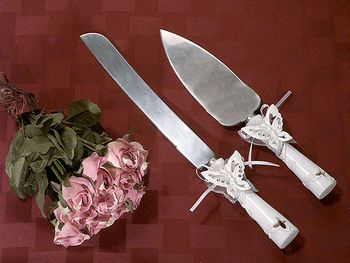 This enchanting butterfly cake serving set includes a knife and cake server. Gorgeous snow white with butterfly butterfly accents with lace is a classy and elegant accessory fit for a wedding, birthday, anniversary, and many other formal occasions. This set is part of a complete package, which includes a pair of toasting flutes, guestbook, and signature pen.