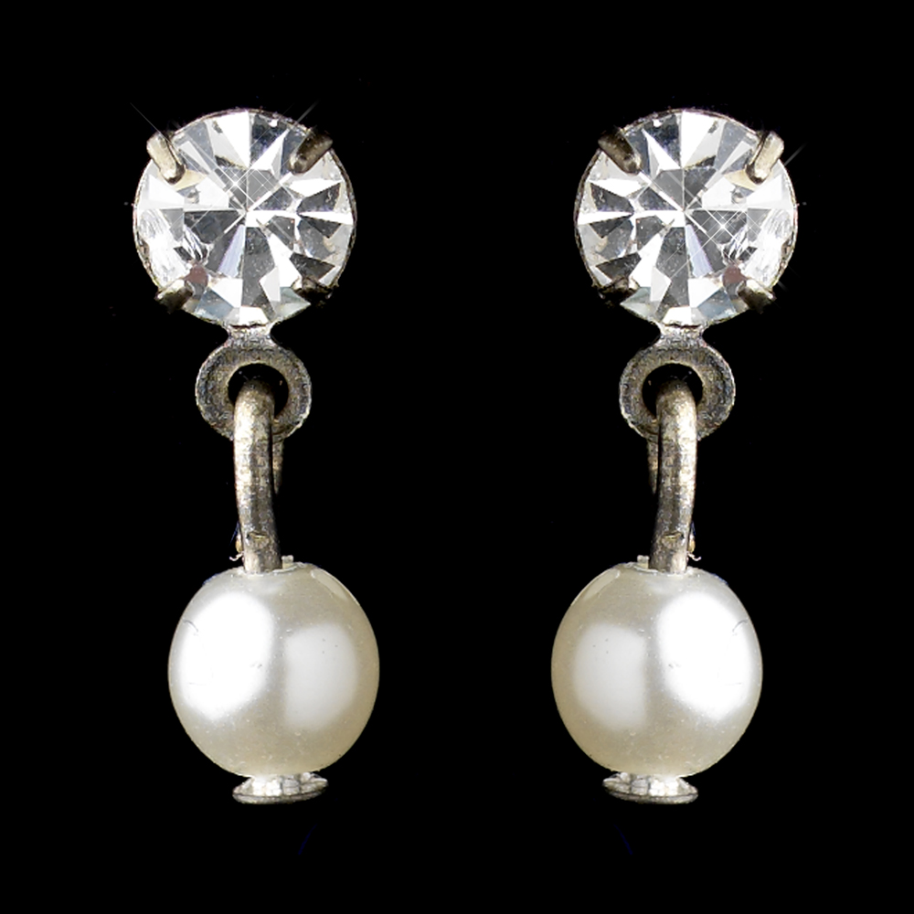 Silver White Pearl & Round Rhinestone Drop Pierced Earrings 8820 * Discontinued *
