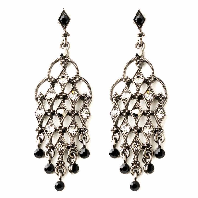 Hematite plated lobster claw clasp chandelier pendant necklace with black and clear round rhinestones. Comes with a matching pair of chandelier earrings.