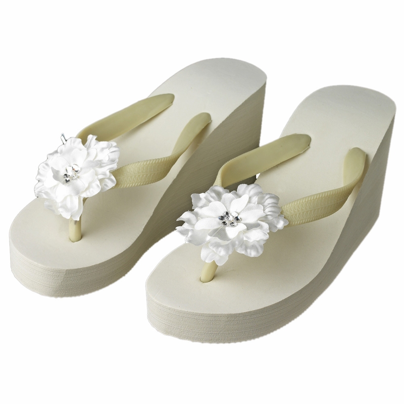 Introducing our new line of elegant high wedge special occasion bridal flip flops with decorative accents. This dazzling and very popular bridal flip flop is the perfect accent to anyone looking for a comfortable yet trendy alternative to wedding shoes. Whether worn to a destination wedding or an elegant event, you'll have happy feet!