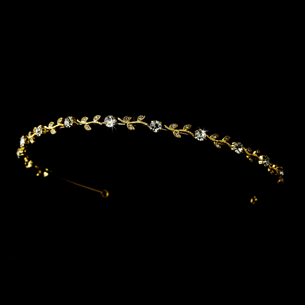 A gorgeous delicate headband designed with small golden leaves encrusted with rhinestones alternating with genuine crystals. A beautiful headband perfect for any special occasion.