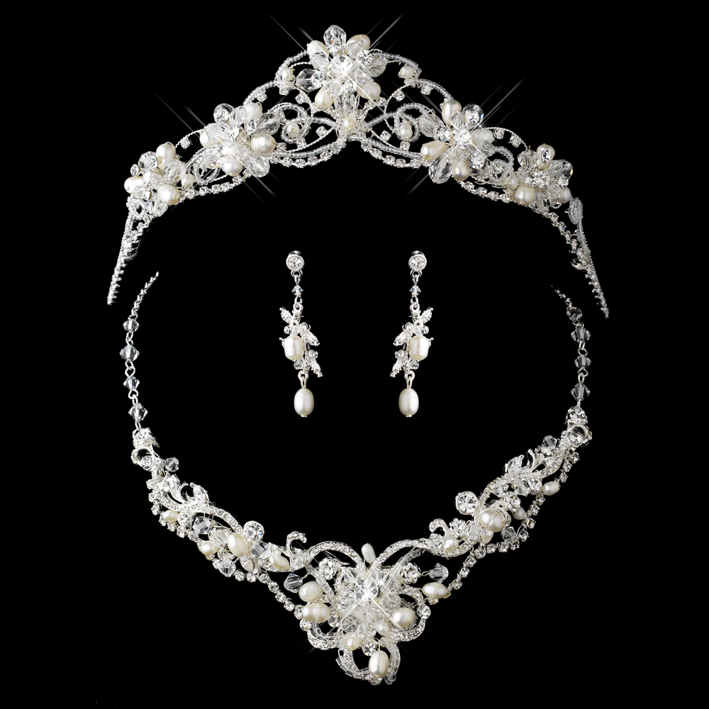 Elegant and ornate, this bridal tiara and jewelry set features exquisite silver plating. The set features ivory freshwater pearls, clear rhinestones, and Swarovski crystals which coordinates beautifully with your white or ivory wedding dress.