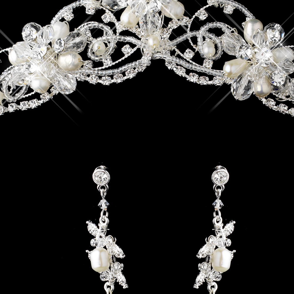 Silver Freshwater Pearl, Swarovski Crystal Bead and Rhinestone Tiara Headpiece 2596 & Jewelry Set 7825