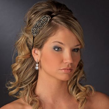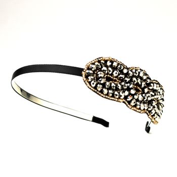 Black satin headband with ornament featuring multi-faceted rhodium Austrian crystals and gentle gold beading. A lovely accessory for any occasion!