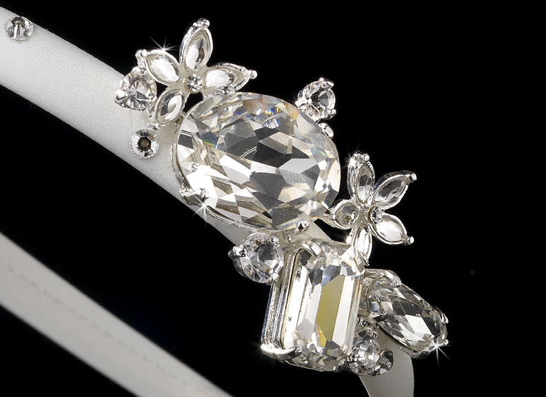 This simple and modern matte satin headband is detailed with stunning rhinestones sprinkled throughout the band, and an artful rhinestone floral ornament decorates one side. Perfect for your modern wedding. The ornament measures 3" wide and 1" tall.