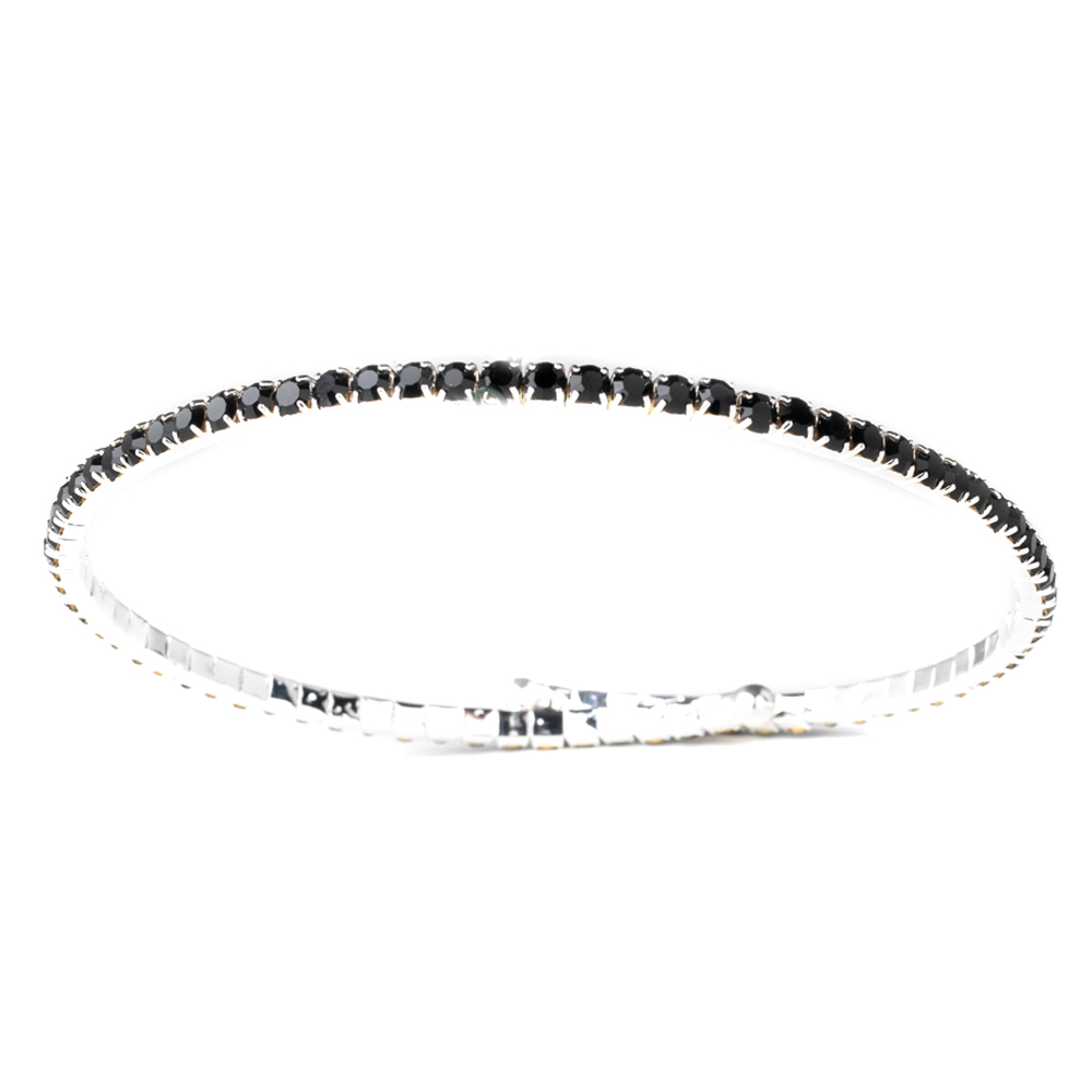 Enchanting black rhinestones sparkle beautifully throughout this silver plated necklace. Versatile, this piece is perfect for your modern, classic, or vintage inspired wedding. The necklace measures 13" in length.