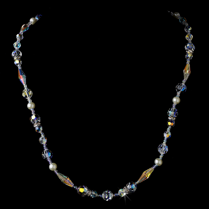 Sparkling and stylish, this silver plated necklace features AB Swarovski crystals, clear rhinestones, and ivory faux pearls. Perfect your spring or summer wedding, this piece measures 27” long with a 3” extender and lobster claw clasp.
