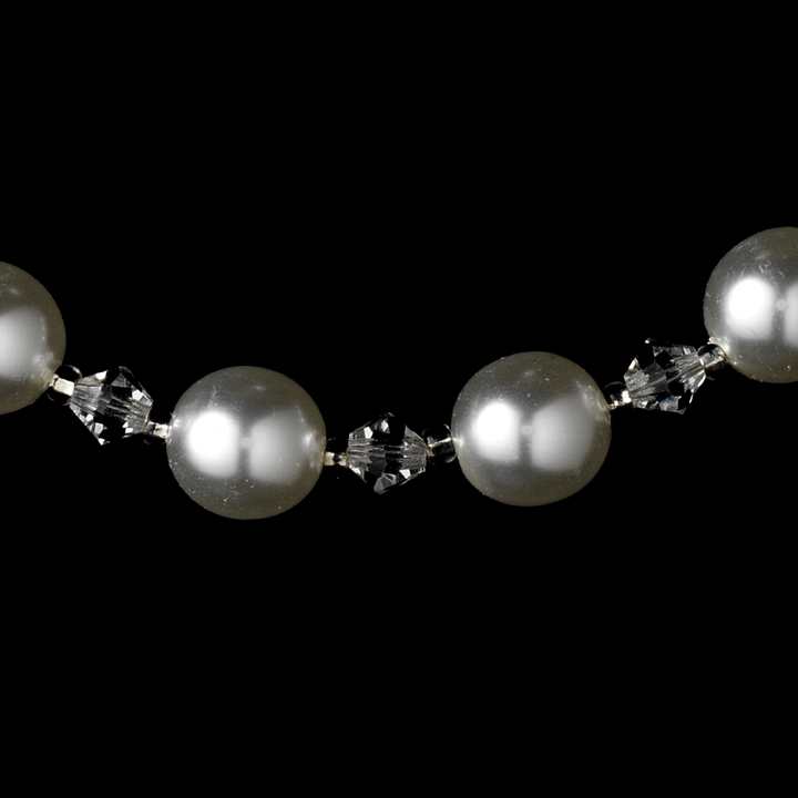 Sparkling and gleaming, this necklace features an exquisite silver plating, clear Swarovski crystals and white faux pearls. A chic addition to your wedding, prom or homecoming this piece measures 16” long with a 2-1/4” extender and lobster claw clasp.
