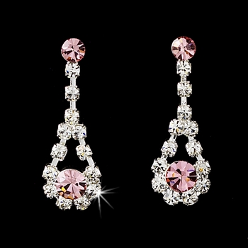 Simple and stunning, this silver plated jewelry set sparkles with clear and pink rhinestones, making the set the perfect addition to your classic, modern, or vintage-inspired wedding. The set beautifully coordinates with your white or ivory wedding dress. The necklace measures 15 1/4" long with a 2 1/4" extension, and the ornament is 1 3/8". The earrings fall to 1 1/4".