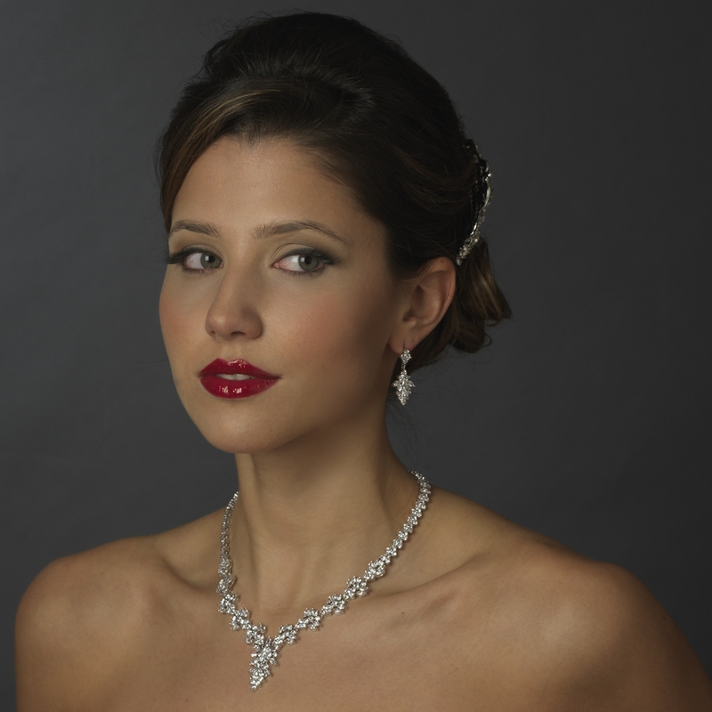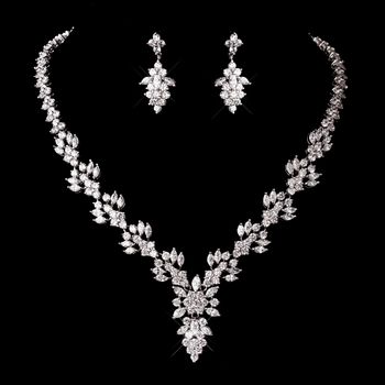 This fabulous bridal necklace and earing set features CZ marquise and round cut stones that sparkles radiantly! This beautiful set is intricate and elegant with a feminine drop in the center that falls perfectly on the neckline! This will surely shine brightly on your wedding day!