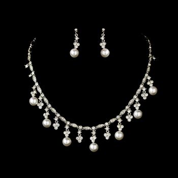 Truly breathtaking, this silver plated jewelry set is adorned with a floral pattern of rhinestone accents and beautiful white faux pearls. The perfect accessory to your wedding, prom, or homecoming. The earrings measure 1", and the necklace is 13-1/2" with a 1" drop and a 3-1/2" extension.