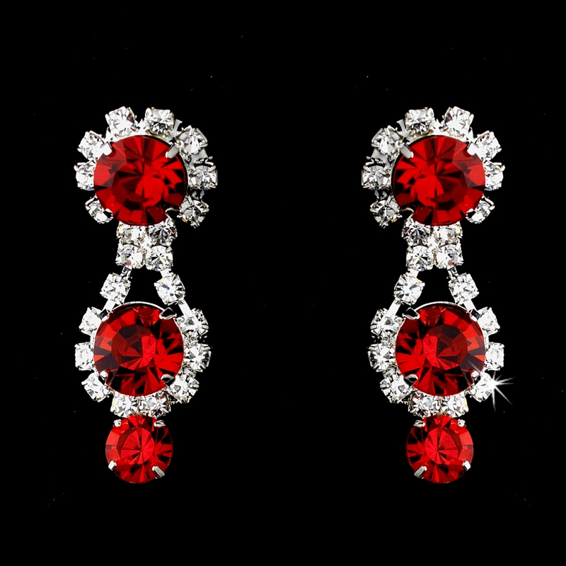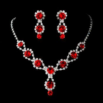 A gorgeous necklace with matching earrings featuring sparkling ruby crystals and clear rhinestones. The rhinestone encrusted silver chain catches the rubies and gracefully drapes each gem with a delicate elegance culminating in a subtle pendant hanging with two beautiful ruby crystals.