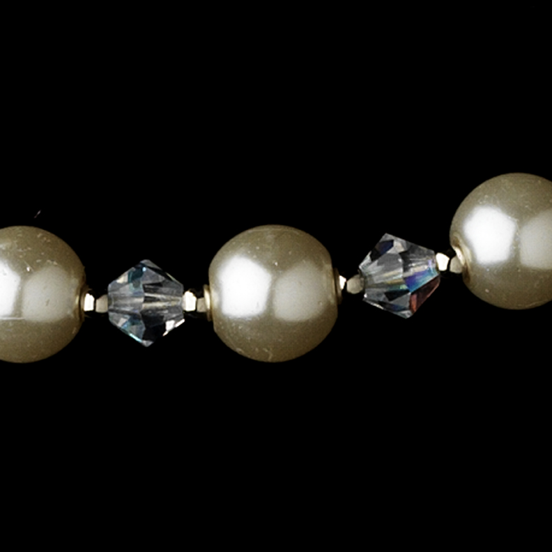 This beautiful choker necklace and earring set will add an extra touch of elegance to your wedding day. Composed of stunning ivory colored faux pearls that alternate with glistening crystals, the necklace is flexible and will bend to fit. The earrings feature a single, shining crystal with a faux pearl dangling beneath it, the two creating an eloquent statement. The necklace will comfortably extend to 13 1/2", and has a 3" extension. The earrings are 1/4" at the widest and dangle 3/4".