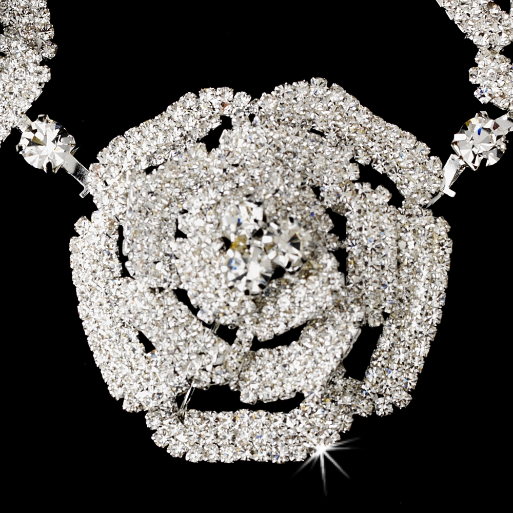 If you're looking to make a statement with your jewelry this necklace and jewelry set is perfect for you! The silver backdrop sets the stage for the sparkling rhinestone encrusting that features dozens upon dozens of gorgeous rhinestones and crystals set in a silver roses. The matching earrings complete this rhinestone flower set.