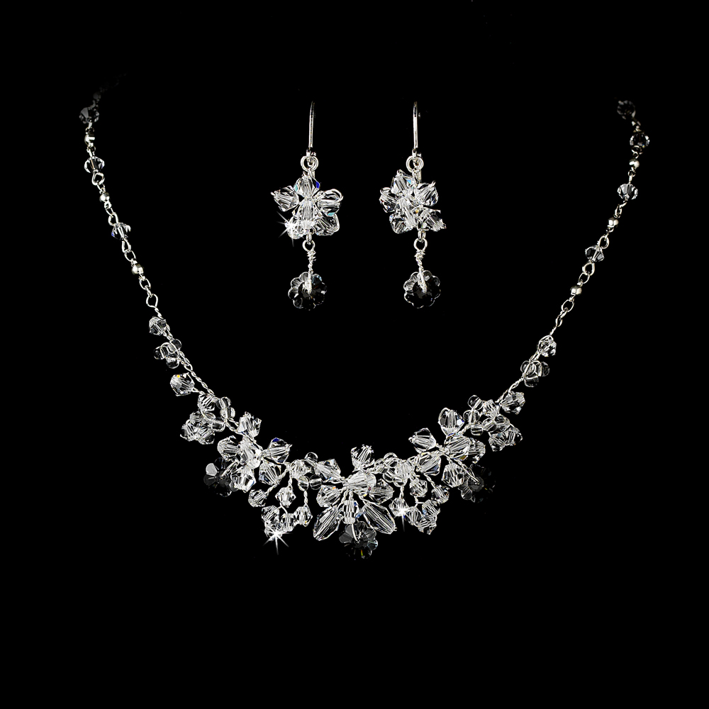 Sparkling and lovely, this silver plated necklace and earring set features clear Swarovski and rhinestone crystals. Perfect for your spring, summer or winter wedding, this bridal set coordinates beautifully with your white or ivory wedding dress. The necklace measures 15”with a 2-1/2” extender and lobster claw clasp. The earrings measure 1-1/4” long.
