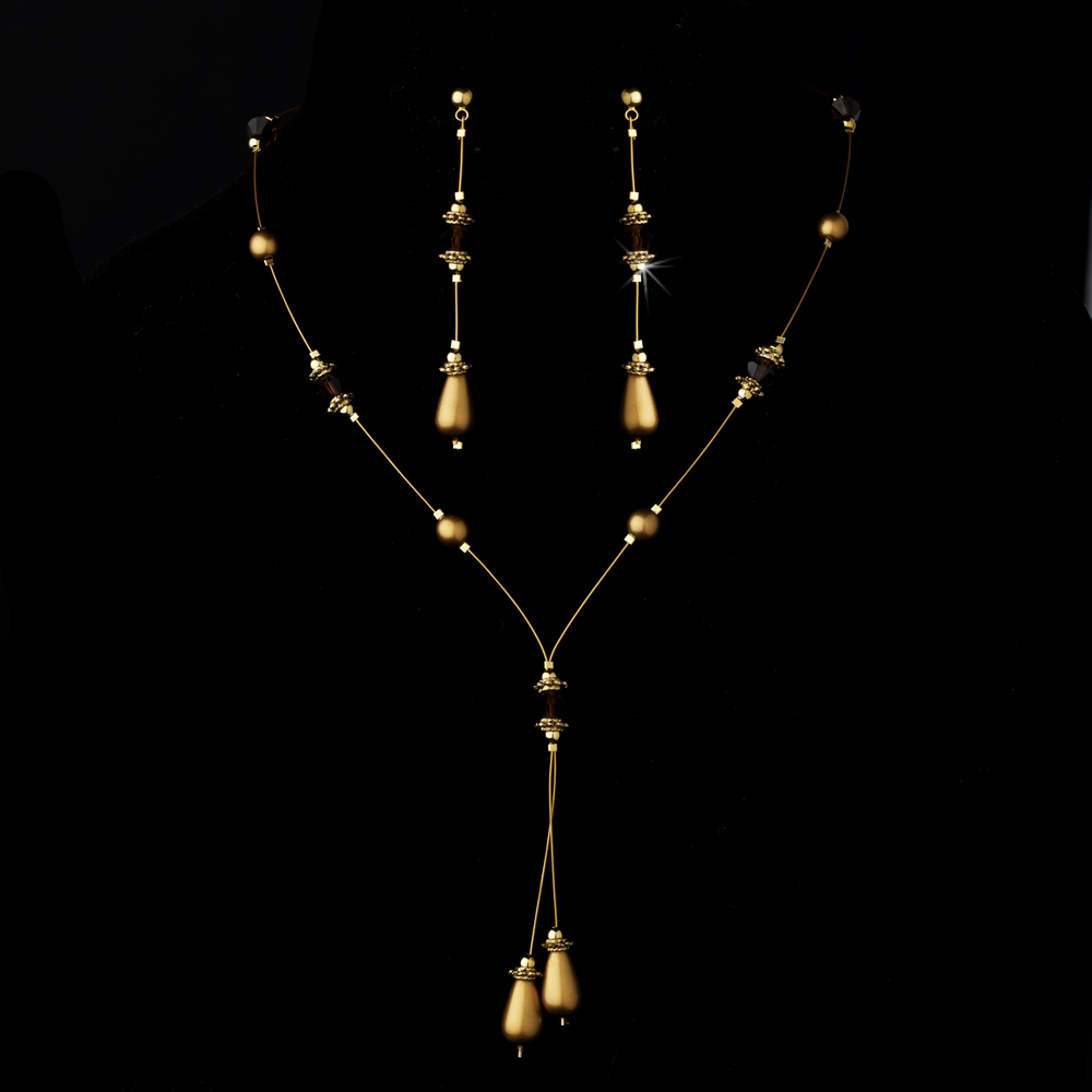 Subtle and elegant, this silver accented necklace earring set is crafted with an invisible strand, featuring beautiful gold brown pearls, Swarovski crystals, and a drop center. This necklace is the perfect addition to your wedding, prom, or homecoming. The necklace measures 16" long with a 2-1/2" extender and lobster claw clasp. The earrings measure 2-1/2" long.