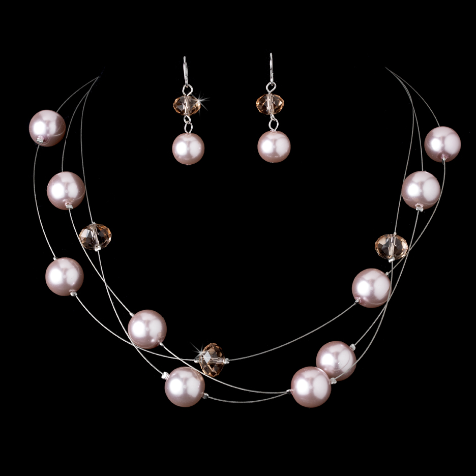 This beautiful necklace earring set features silver plating, clear Swarovski crystals and faux pink beads. A perfect way to add color and sparkle to your neckline on your wedding day. This necklace measures 16" in length and has a 3 1/2" extender, the earrings measure 1 1/2" in length.
