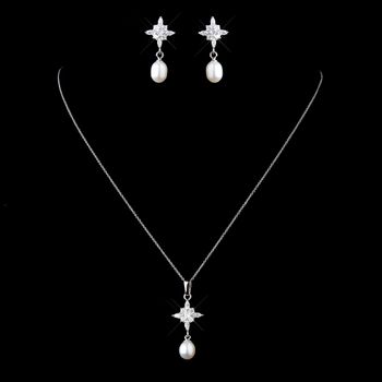 A lovely Solid 925 sterling silver necklace and earrings set, featuring a flower design composed of sparkling Cubic Zirconias and with a luscious fresh water pearl drop that adds an extra touch of elegance. This set will look stunning on brides, bridesmaids or girls attending prom.