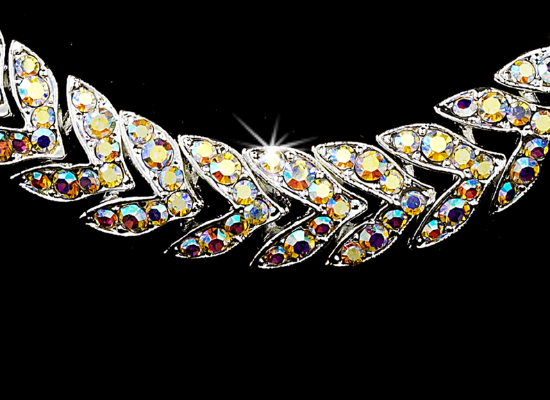 Graceful and elegant, this AB accented laurel wreath-patterned jewelry set will dazzle on your wedding day. A beautiful gathering of rhinestones makes this set truly memorable. The silver plated necklace measures 13-1/2" long with a 2-1/2" extender and lobster claw clasp. The matching earrings measure 1" long. Matches bracelet B 373 AB.