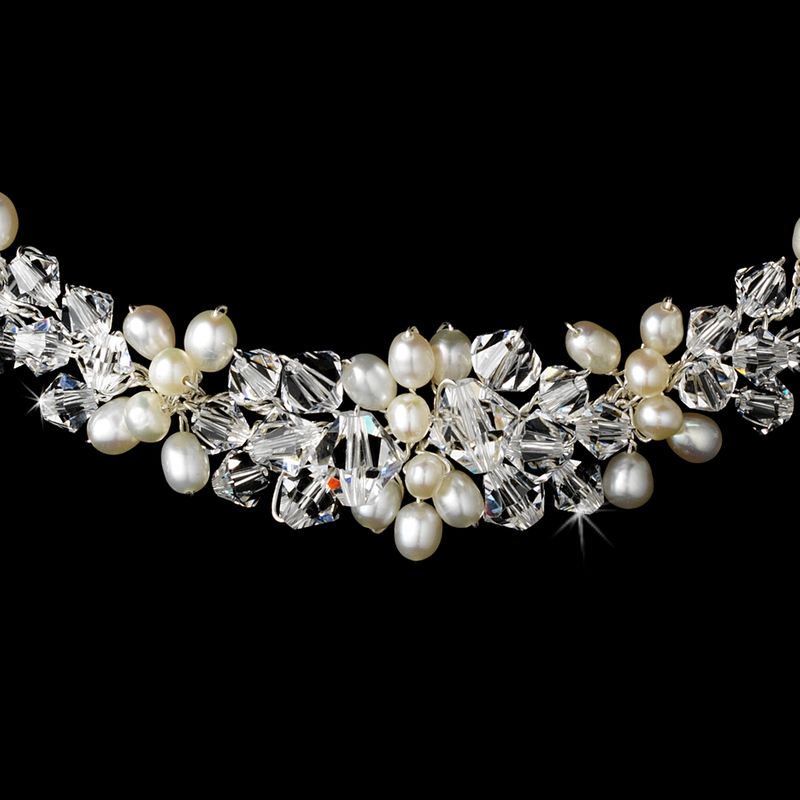 Simply spectacular, this silver plated necklace and earring set features ivory fresh water pearls, clear rhinestones, and Swarovski crystals. This set coordinates beautifully with your white or ivory wedding dress, and is a divine choice of accessory for your spring, summer or winter wedding. The necklace measures 14-1/2” long with a 4” extender and lobster claw clasp. The earrings measure 1-1/4” long.