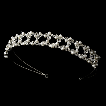 This elegant headband features silver plated loops of ivory faux pearls and sparkling rhinestones. The piece is perfect for the classic bride, and lovely with your white or ivory wedding dress. The ornamented portion measures 8-1/4" wide and 3/4" tall, and the piece ends with two loops that allow you to fasten it in your hair with bobby pins.