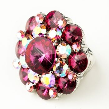 This delightful fuchsia pink AB crystal rhinestone flower ring features a large flower design composed of dazzling fuchsia pink and AB crystal rhinestones set on an adjustable stretch band. This piece will look great with any ensemble for any occasion, formal or casual!