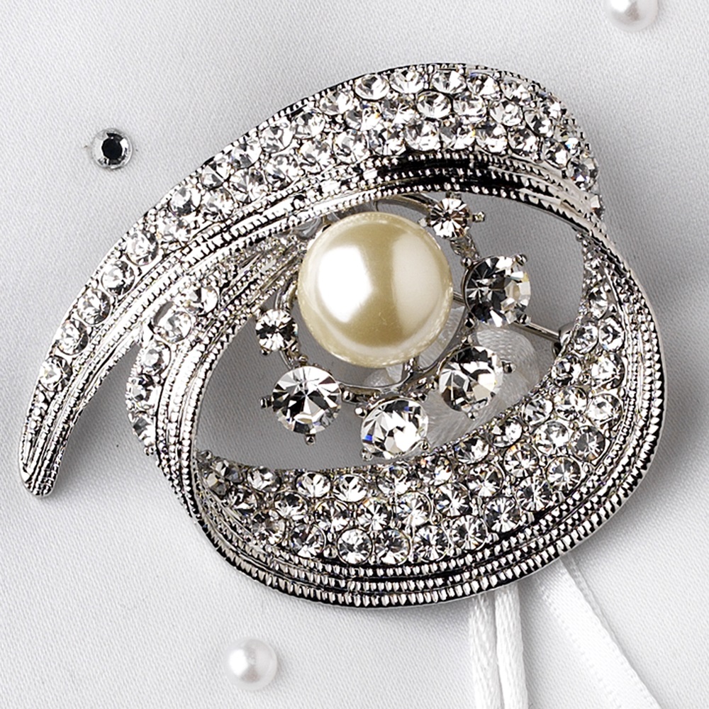 Radiant crystal brooch decorated with ivory pearls at its center; this curled brooch features an elegant design with sparkling beauty and will add a touch of class to any outfit. Pin it on a ring pillow to give that special touch of elegance.
