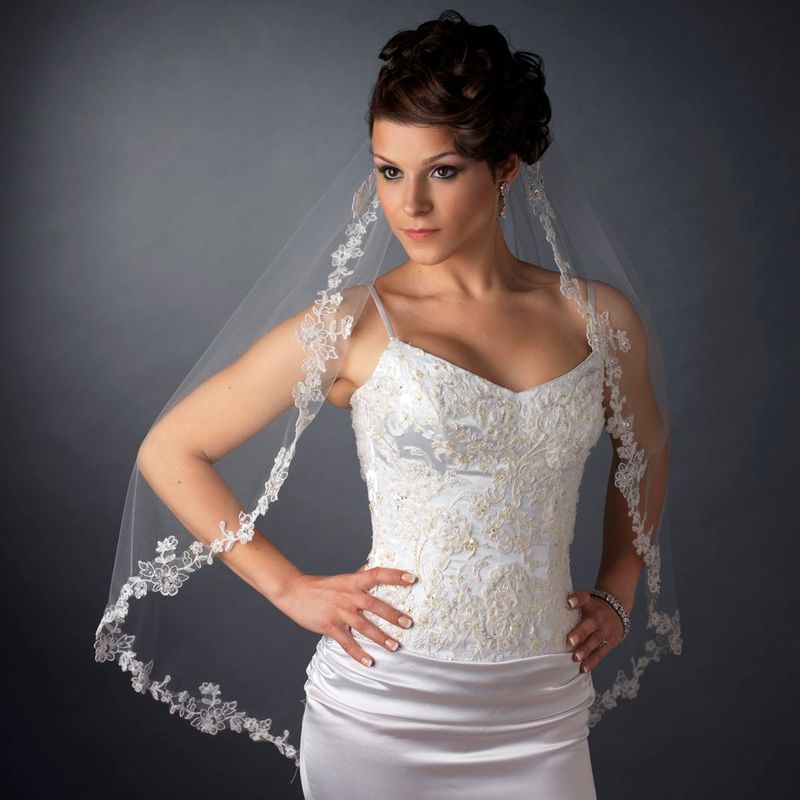 Single layer fingertip length bridal veil with a floral lace applique edge accented with sequins with clear and lt silver tiny bugle beads