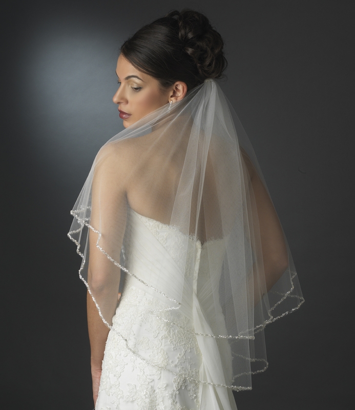 This double layer veil in elbow length features a simple yet irresistible style that family, friends and guests will not be able to take their eyes off of! An intricate edge of majestic bugle beading and dainty Faux Pearls combine to form the most divine sparkle.