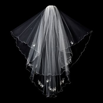 Elegant scalloped pencil edged bridal veil with tiny pearl & bugle bead floral vine embroidery accented with sparkling rhinestones.